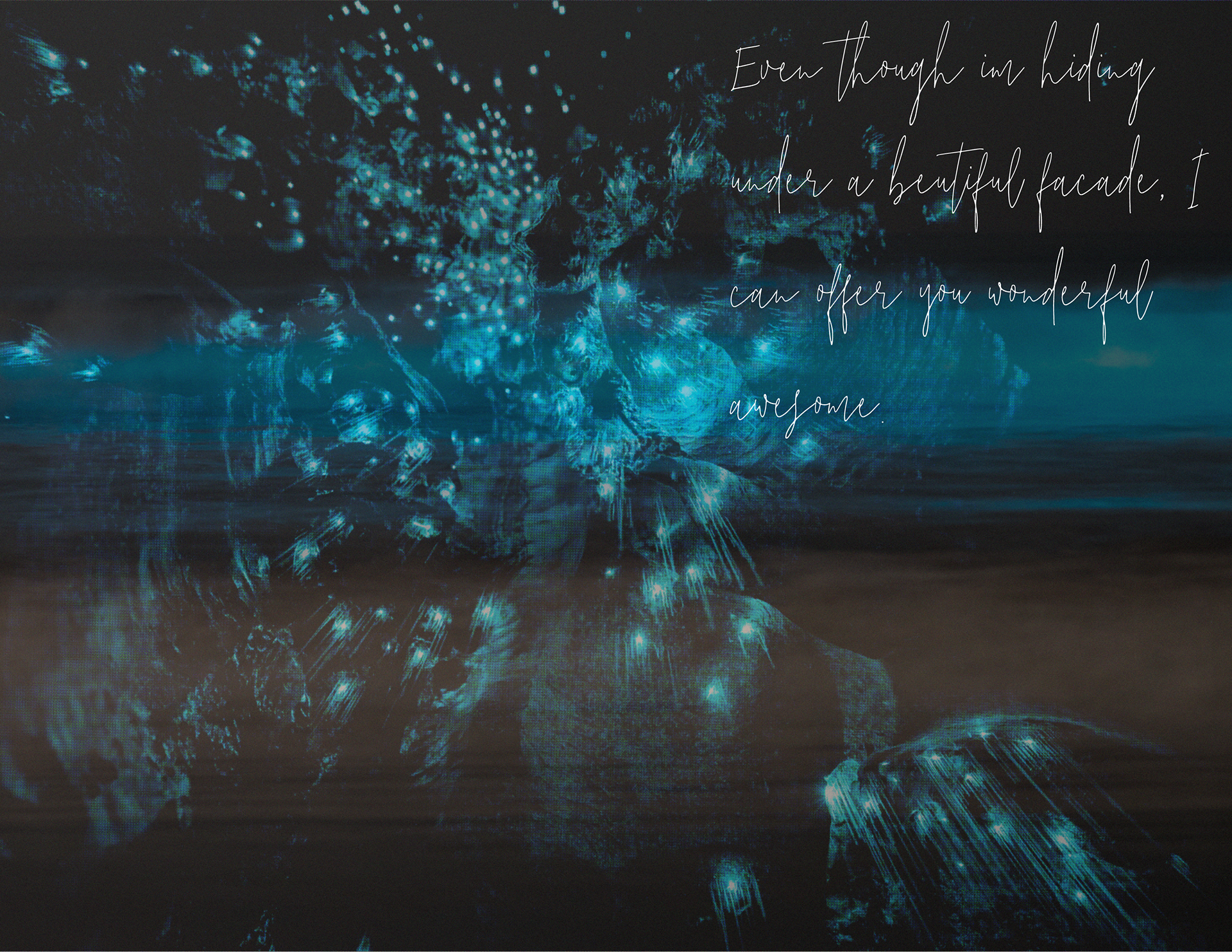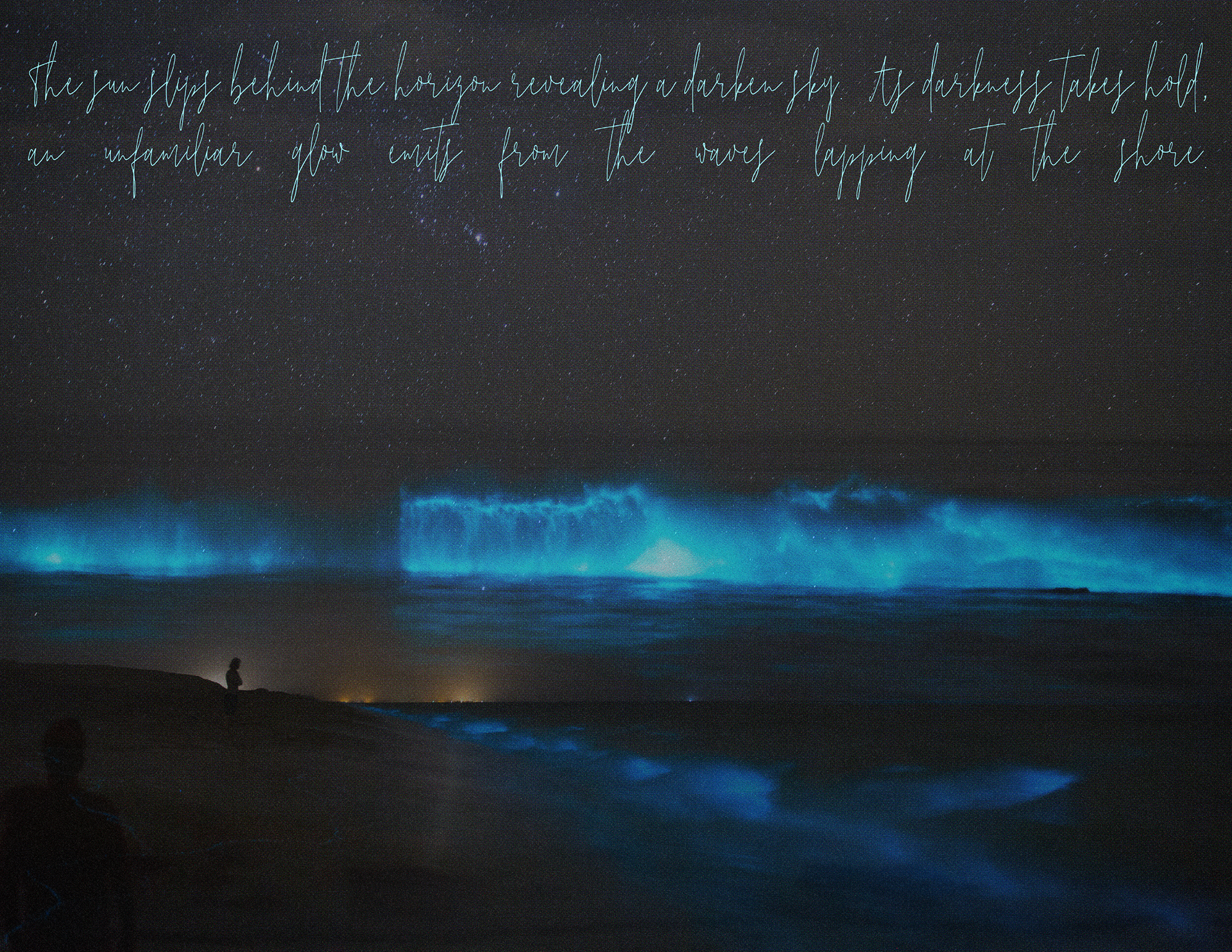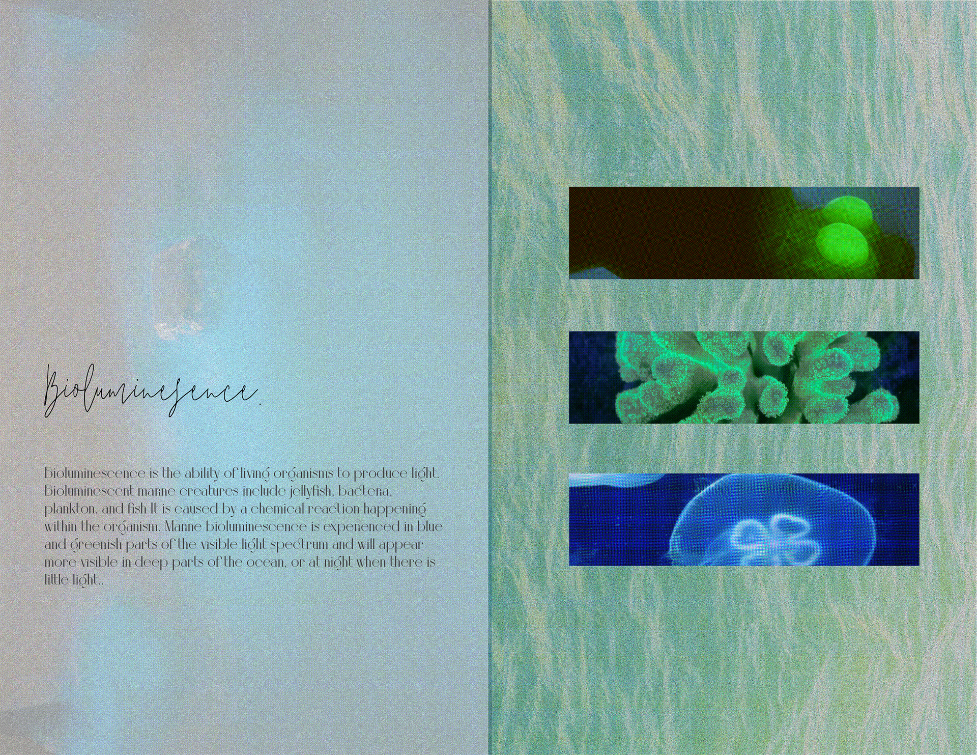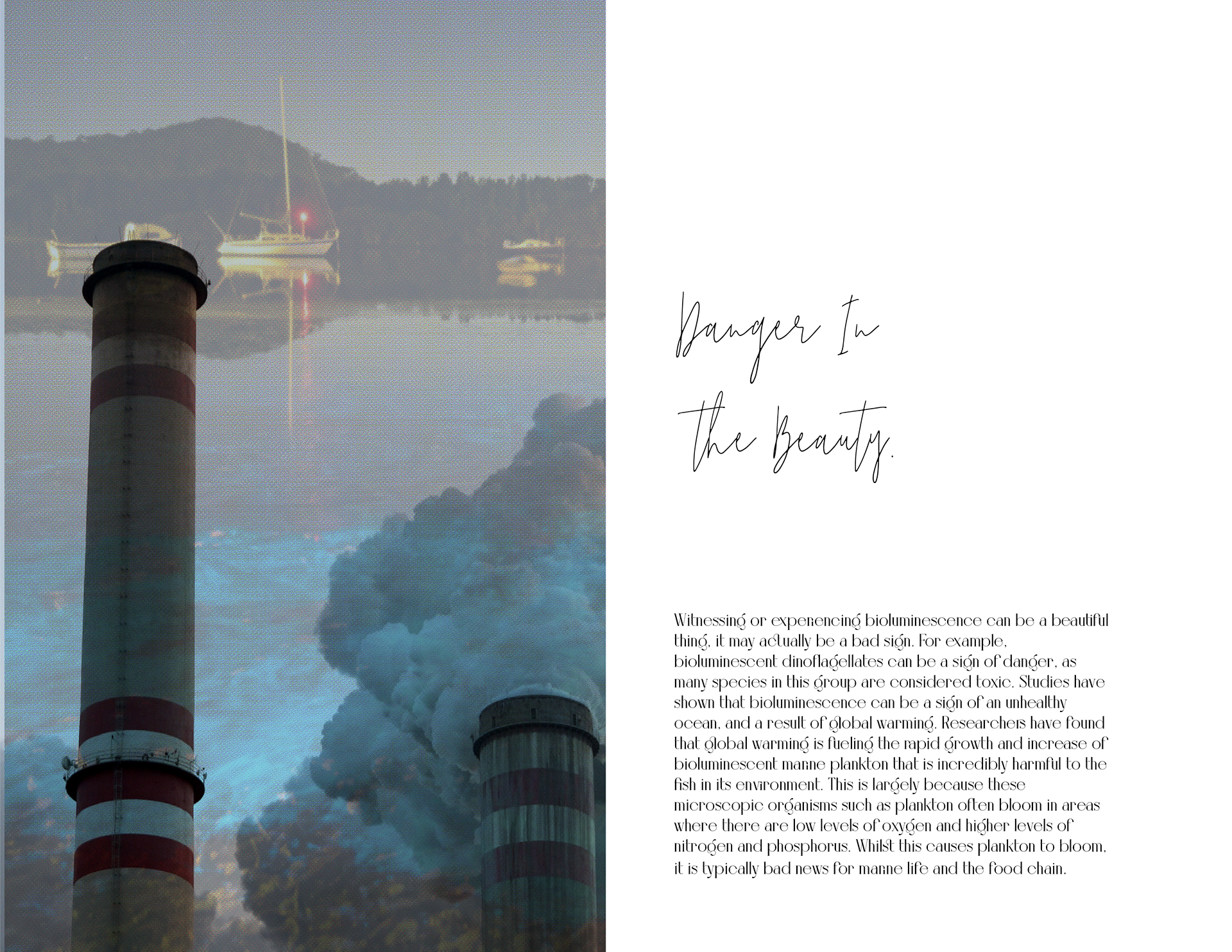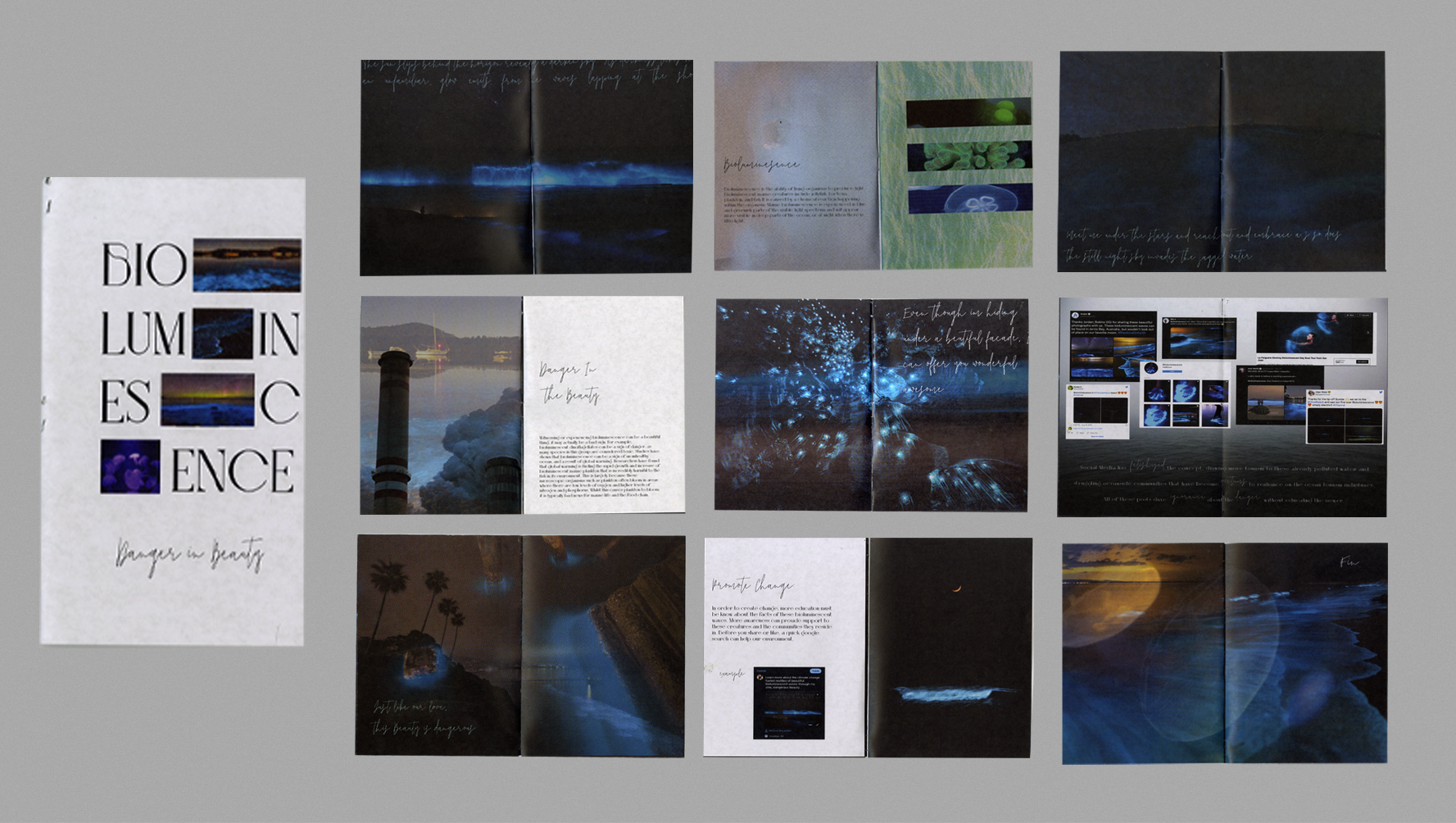 "Bioluminescence: Danger in Beauty" is a zine I created to explore the fetishization of bioluminescent beaches on social media. These stunning glowing beaches, caused by bioluminescent algae, captivate viewers, but what they don’t know is that the glow has intensified due to the harmful effects of climate change. In this piece, I blend poetry and education to craft a scientific narrative that actively engages the reader, rather than simply relaying information.